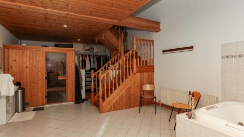 Entering the property through a glazed entrance porch with tiled floor and feature stone wall, to the main hallway, with w.c/cloaks and stairs to first floor. Leading into the magnificent living/dining room 47ft x circa 16 ft. One end leads to the newly fitted white kitchen and utility with walk in larder and the other to the ultimate master suite with a feature changing room, lounging area, en-suite with sauna, jacuzzi and fitness loft. To the first floor there are four/five further bedrooms, two generously proportioned en-suites and a family bathroom.