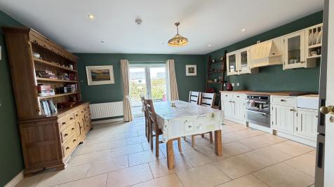 Accommodation features an open plan living area which can be divided with double doors. Upon entering through a hardwood entrance door with glass side panel you are welcomed into the entrance area leading to a large sitting room with feature solid fuel stove, double doors to kitchen/dining with patio doors to a beautifully landscaped garden. A separate utility room and walk in store/press also feature off the kitchen. To the first floor there is a family bathroom and three spacious bedrooms, master having a walk in wardrobe and en-suite.