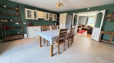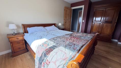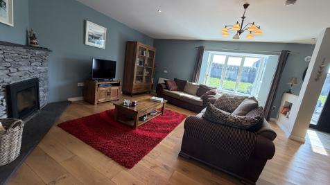 Accommodation features an open plan living area which can be divided with double doors. Upon entering through a hardwood entrance door with glass side panel you are welcomed into the entrance area leading to a large sitting room with feature solid fuel stove, double doors to kitchen/dining with patio doors to a beautifully landscaped garden. A separate utility room and walk in store/press also feature off the kitchen. To the first floor there is a family bathroom and three spacious bedrooms, master having a walk in wardrobe and en-suite.